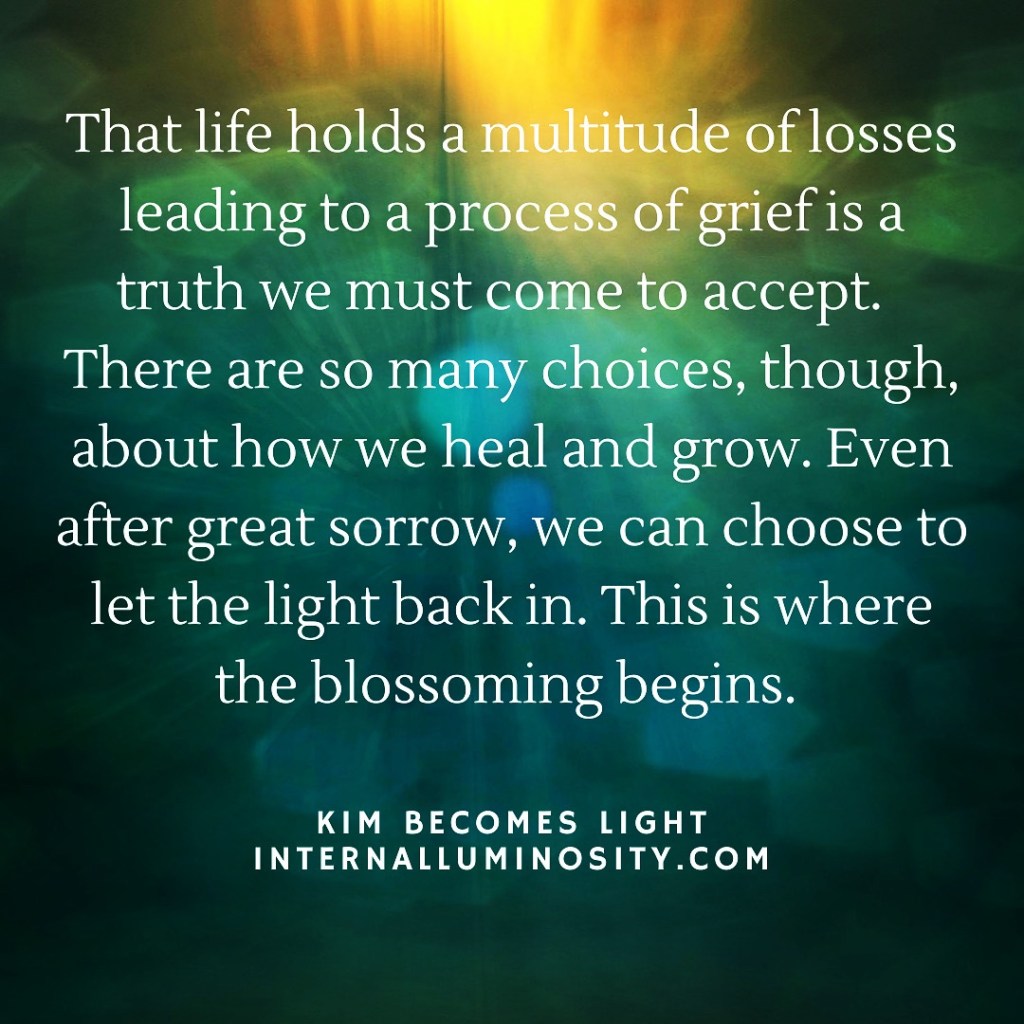 Healing doesn’t happen all at once, nor does growth or revealing all of your light. It takes a village of helpers, a cocoon of companions, a multitude of choices and, quite likely, the length of a life. This doesn’t translate into a lifetime of sorrow or somber attitude. Rather, it creates dazzling depths, moments of magic, intriguing texture, spontaneously emerging emotion and joy that rides right alongside sorrow.
