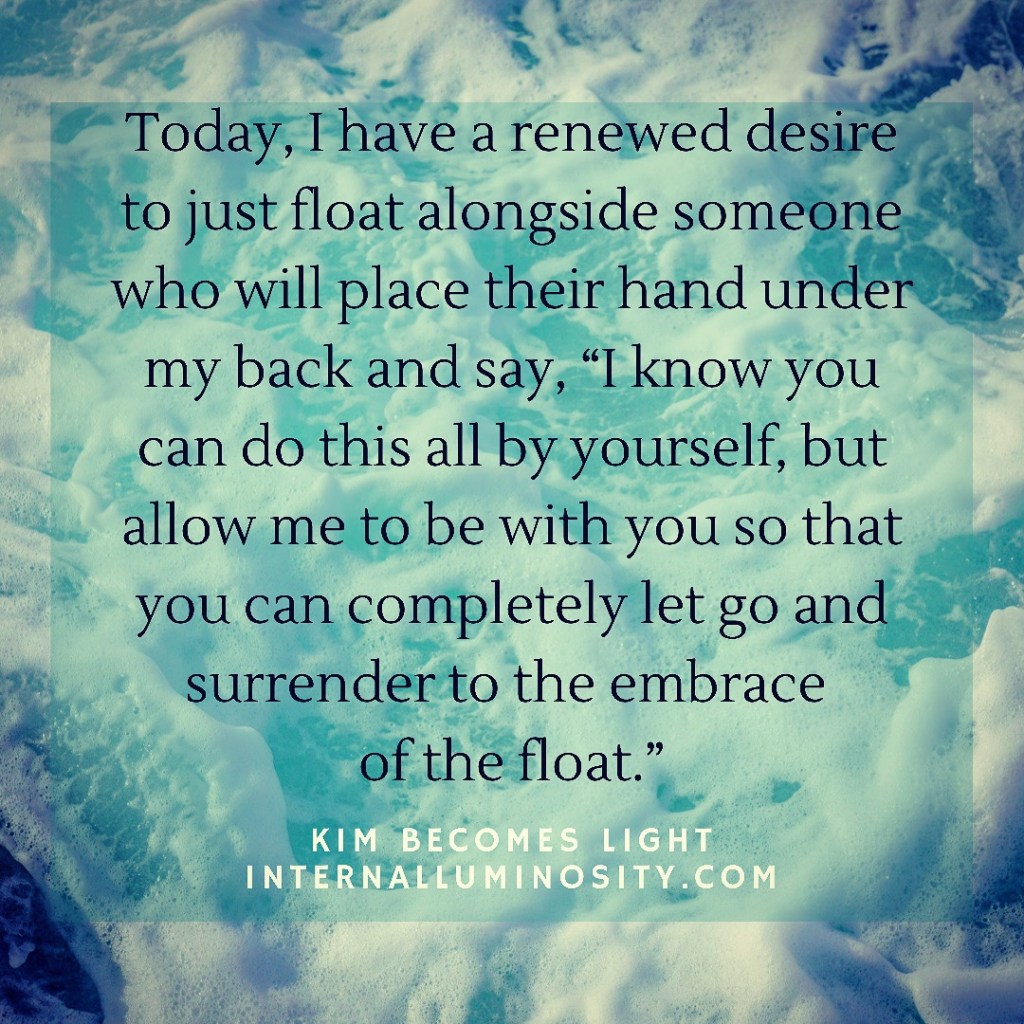 Today, I find myself with the strength of a swimmer that comes with years of practice and experience, but also with a weariness. Just because I can dive into those rough waters and come out the other side doesn’t mean I want to continue to struggle. I have a renewed desire to just float alongside someone who will place their hand under my back and say, “I know you can do this all by yourself, but allow me to be with you so that you can completely let go and surrender to the embrace of the float.”