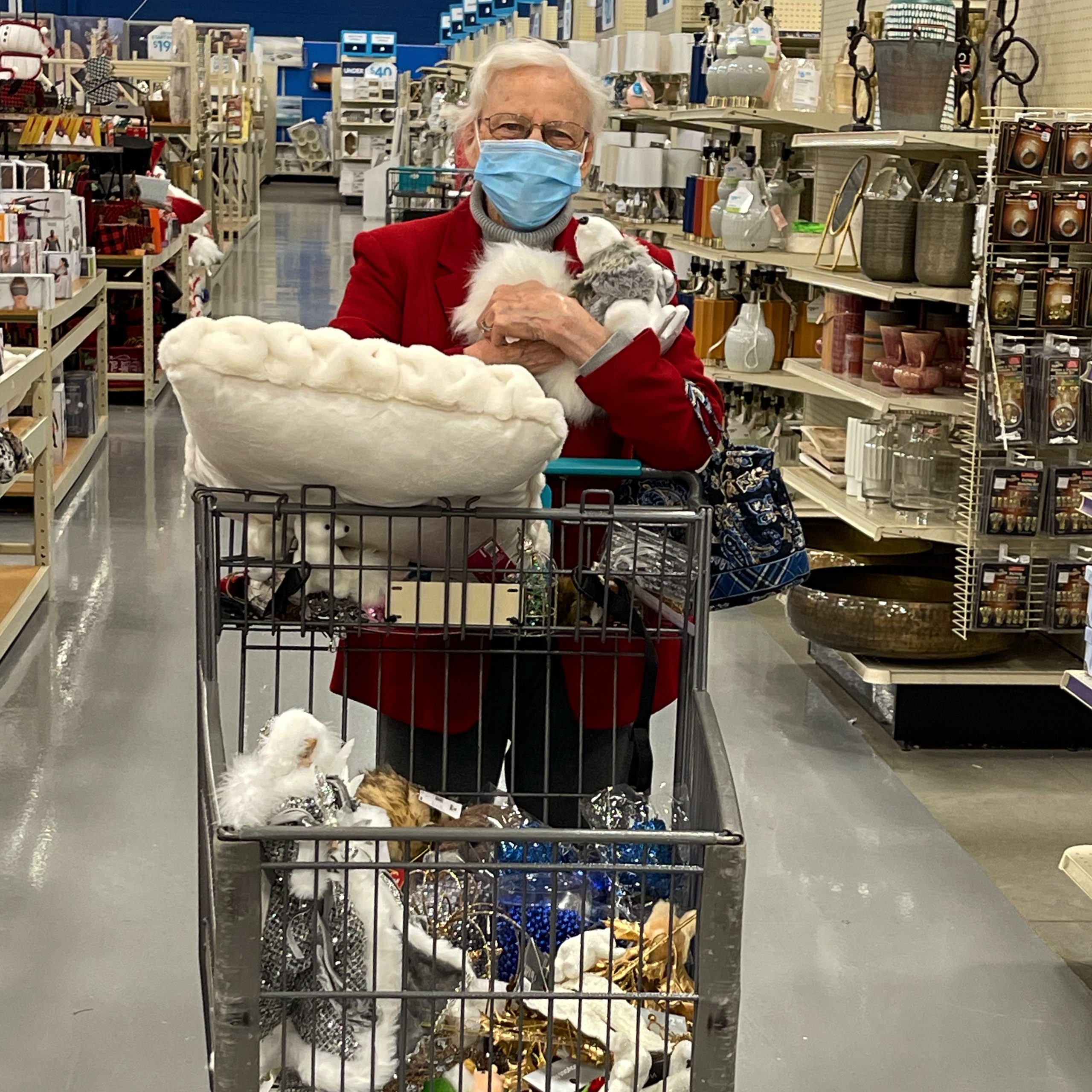 When she liked something, I would just put it in the cart. “Oh, Kimmy! You’re terrible,” she would say. Then she started doing it on her own—in multiples! My dogs were barkin’, but Mom’s joy and energy were so big, I just let them carry me. She confessed to the cashier that she never spends money like this and declared her favorite purchase of all to be a fluffy, silky soft, white squirrel that she kept hugging.